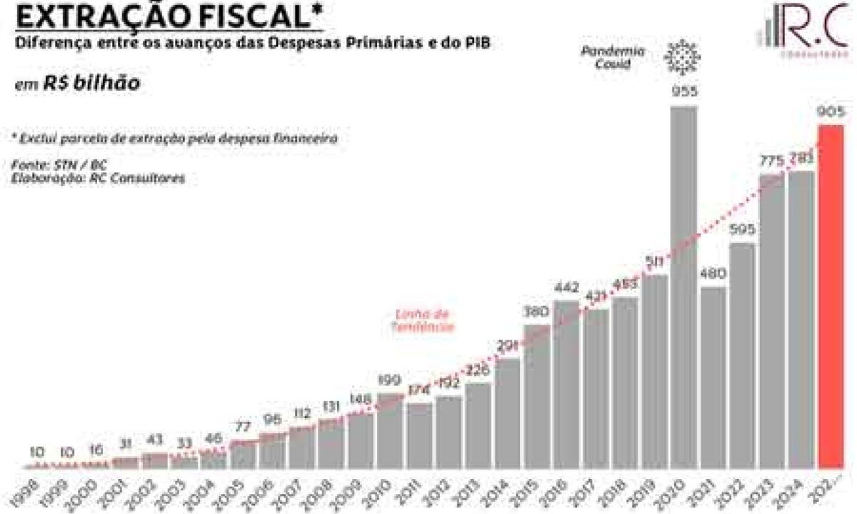 Os valores a mais, extraídos do bolso dos brasileiros, apenas em 2025, correspondem à cifra escandalosa de R$ 905 bilhões. É uma escalada de gastos primários (sem contar a despesa com juros da dívida pública) em excesso à proporção média de 17% do PIB, então praticada no início da estabilização econômica. Essa proporção saltou para 24% do PIB. Uma pancada sobre os contribuintes.
